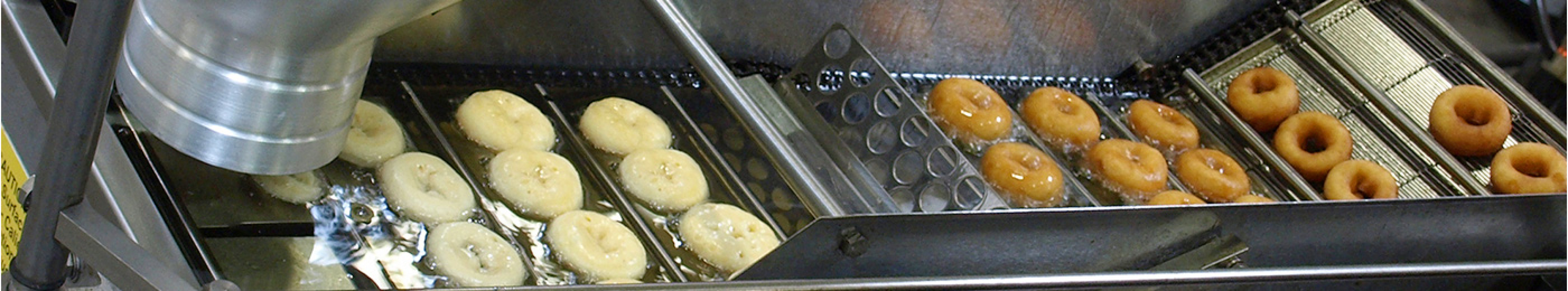 Automatic fryer for fast production of mini donuts. Capacity 102 dozen/hour, gas heated.